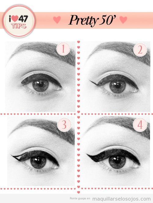 El maquillaje de ojos de los años 50 buscaba resaltar la mirada sin recargarla. El delineador negro era la clave, aplicado con precisión a lo largo de la línea de las pestañas superiores y extendiendo ligeramente hacia afuera en forma de «cat eye».