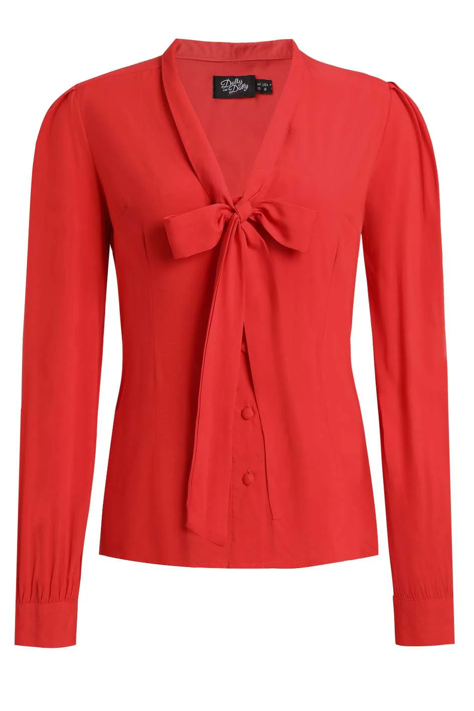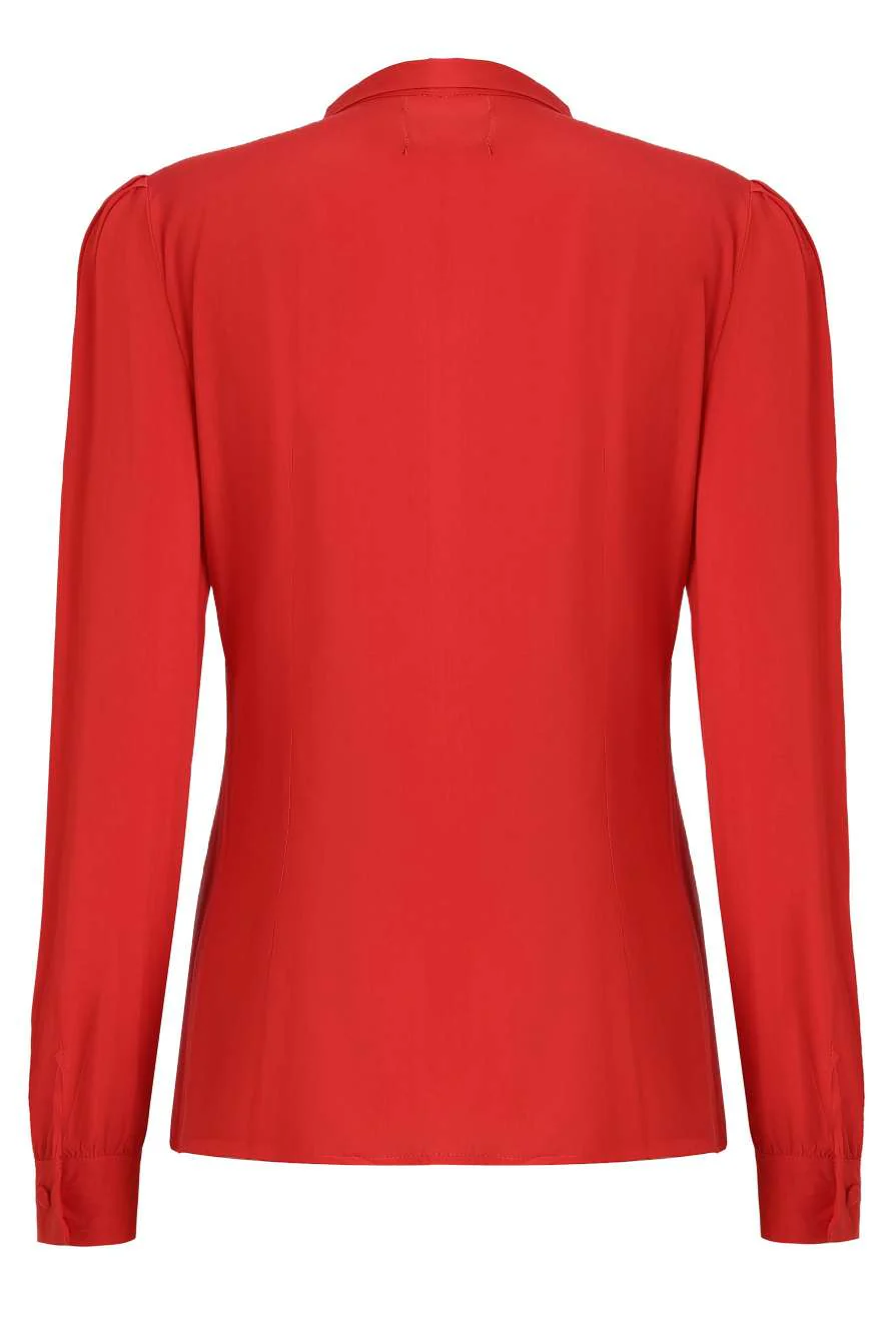 Presenta un favorecedor escote en V con un lazo femenino que añade un toque romántico, junto con un cierre frontal de botones a juego que facilita su estilo. Sus mangas largas terminan en puños limpios, mientras que los delicados pliegues en los hombros aportan una estructura elegante y clásica. Confeccionada para un ajuste cómodo, es la prenda ideal para combinar con faldas de vuelo o pantalones Marlene, asegurando un look impecable tanto para la oficina como para una ocasión especial.