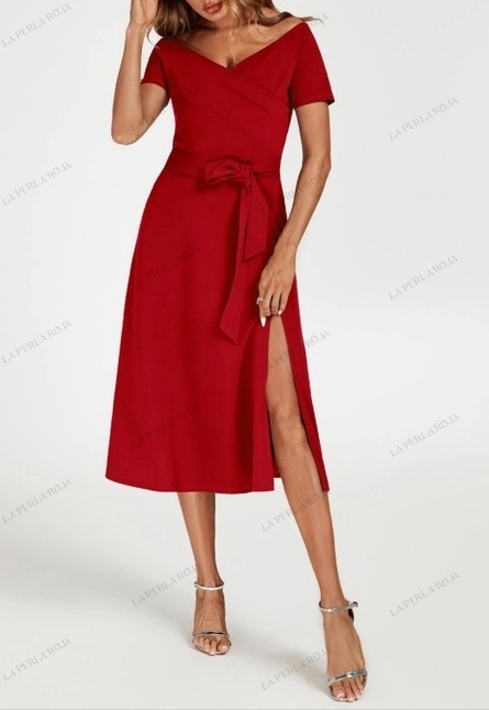 - Detalles Clave: Escote en V cruzado, largo midi, lazo en cintura, apertura frontal.